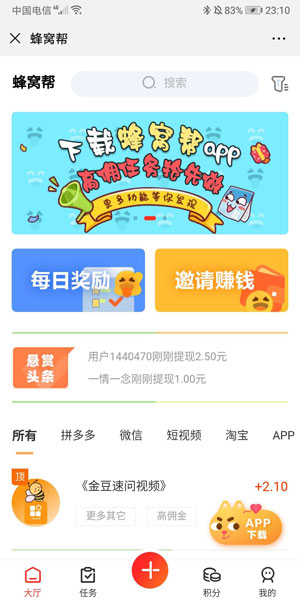 安卓版下载 大小:5.07 MB 下载:3256次 蜂窝帮 支 持:安卓苹果 分 类:手机软件 大 小:5.07 MB 版 本:1.0.12 评 分: 开发者:重庆夭夭网络科技有限公司 下载量:3256次 发 布:2020-03-14 10:01 手机扫码免费下载 #蜂窝帮截图 #蜂窝帮简介 蜂窝帮,让您的闲暇时间变得更有价值。蜂窝帮APP是一款手机悬赏任务平台,悬赏、互助,帮人忙就能赚钱!用户在这里,不仅可以通过完成悬赏任务来赚佣金,还可以发布任务供其他用户完成。海量悬赏任务,让你的业余时间变得更有价值! 【平台特点】 上一个 上一篇:暂无 下一个 下一篇:截图宝 猜你喜欢 西柚资讯3256次下载 下载 快音3256次下载 下载 金刚涨3256次下载 下载 抢先收3256次下载 下载 趣看天下3256次下载 下载 中青看点3256次下载 下载 大五福3256次下载 下载 魔视3256次下载 下载
